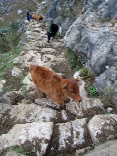我们和牛儿抢道呢 这路完全就是这些牛走出来的 脚底板都痛了