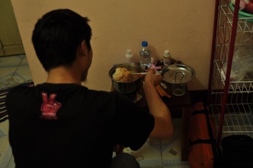 提供一个信息给吃不饱的朋友:夜市开端不远的北侧有小巷连接菜市场的,10千一份的粉或饭选择较多有盒饭形式量较足。当晚宜人的天气,我们再逛夜市,遇到一厦门的mm,也苦说吃不饱,一圈绕完到起点再遇猛吃mix果汁的和她同宿的北京mm,一起控诉此地的高价少量的food,畅谈越南之法棍实惠抵饿。遂确定明中午大吃一顿。