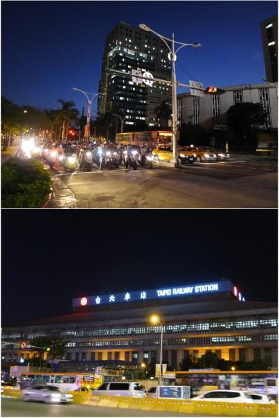 最令我们震撼的还是台北街头的机车。这景观真不是盖的(和越南有一拼吧),每个十字路口都南来北往穿行不绝。红灯的时候,密密麻麻的黑影和刺眼的车灯便靠成一排,然后一层、两层、三层,只听得一片引擎声沉吟着蓄势待发,如同待命的部队,形成大军压境的压迫之势。一旦红灯转绿,引擎便即刻咆哮起来,机车大军中无一不似离弦之箭,脱缰悍马,在我们眼前浩浩荡荡呼啸飞奔而去,轰鸣声震耳欲聋,让人头皮发麻。说实话,初来乍到,真被这阵势吓到了,一点都不敢不老老实实地遵守交通规则,生怕从哪里又突然蹿出一匹野马来,将我们瞬间撂倒。。。