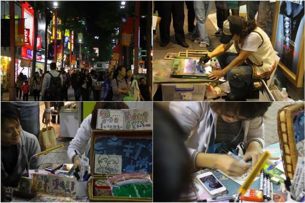 走进西门町商业街,便再次没入**。果然是年轻人的聚集地,基本看不到什么大叔大妈。我们也信步由缰。有艺人弹吉他表演,现场制作Q版公仔、画像等等,也有一些小吃摊。街边的商家鳞次栉比,吃穿玩用,算是购物淘宝的不错地方。