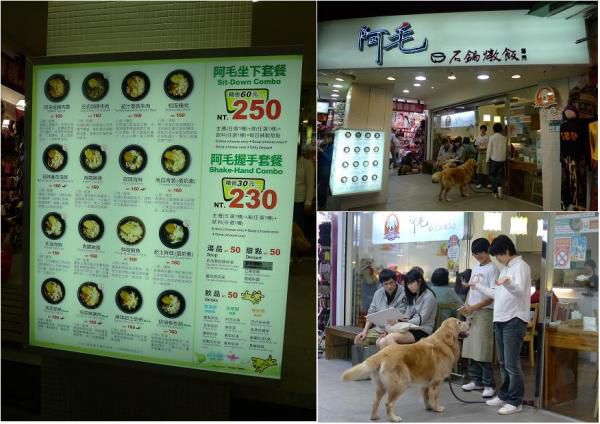 在这里首遇“保险套天堂”连锁店,原来是卖各种比较色色的小玩意儿。一家石锅拌饭餐厅,很搞,主打他家宝贝狗狗的招牌,名字就叫阿毛,想来必是狗名,然后什么“阿毛坐下套餐”、“阿毛握手套餐”。。。然后主角就在旁边很粘人地晃来晃去。这完全是利用爱狗人士的好感,跟宣传宠物周边差不多了。