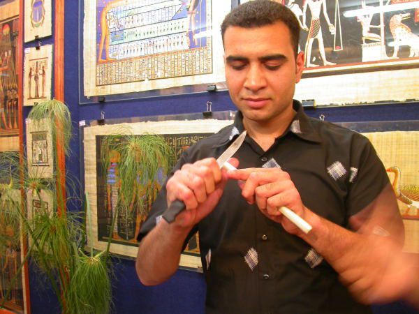 中国的竹木浆造纸术纸张精美发展成为现代造纸术,埃及的造纸术比中国早,采集水边的一种草,用石头敲扁压出汁后用水洗掉去糖分,然后放入水中很长时间,仅留纤维后成经纬状编织成一片,放在石头下面压平阴干,这种纸不怕水湿不拍手扯,坚固耐久,金字塔中发现的4700年前的彩绘画就是这种纸(后续的博物馆中会有照片展示),这就是草纸。