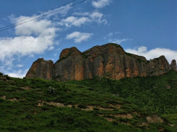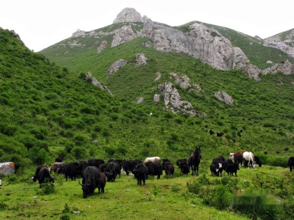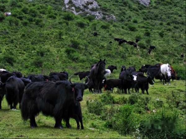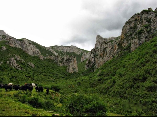 转过几个湾,终于到达大学生口中的那块牧场,四周被峭壁悬岩包围,危峰兀立,牛羊成群,让人仿佛走进一片世外桃源。面对我这个突然闯入者,成片的牛羊马匹纷纷撤退,唯独一头毛皮黝黑的牦牛不为所动,用凌厉的眼神注视这我,并像老大一样挡在其他牛羊的身前,此情此景,我被震撼了,眼前的一切如梦似幻。