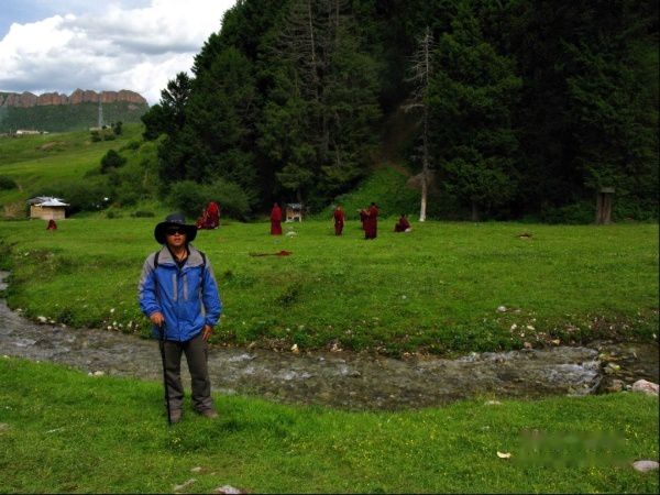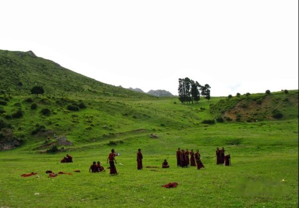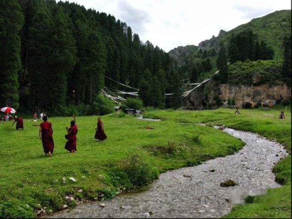 峡谷入口有块平整的草地,小河边上环境清幽宜人,很多小喇嘛在嬉戏和运动。