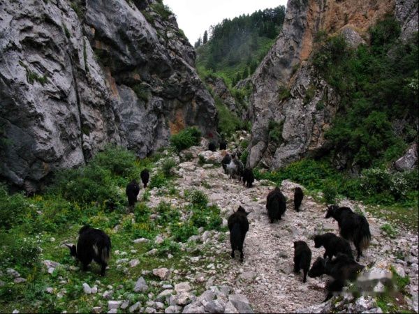 不久,山谷渐渐传来几下舒缓的歌声,声音越来越近,仿佛是藏族的唱诗,但又更像是一首当地的童谣,很快,迎面就走过来一个背着书包的小女孩,见到有陌生人,她停止了唱歌。让人称奇的是,此时小女孩的身后还跟着数十头牛羊,原来是个放羊娃。上前跟她聊了几句,发现小女孩是会汉语的,她告诉我这些牛羊都是家里养的,她在前面带路,牛羊大部队后面还有她妈妈。峡谷的路太窄,牛羊得一个接一个过,可能见到了生人,我身边好多牛羊都不敢过了,有几条小羊则是跟我对望了几眼,然后快速从我腿边闪过,小女孩告诉我牛羊都是怕生的,于是我站得远远的,牛羊大部队最后才得以顺利通过。小女孩叱喝着,逐渐消失在我的视线内,那些童真的、舒缓的歌声再次响起……
