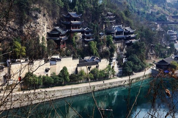 青龙洞建于明代中叶,至今已有500年历史,几度毁于兵火,几度修复,由藏经楼、大雄宝殿、望星楼、紫阳书院、万寿宫、六角亭、文公祠等组成。整群建筑背靠青山,面临绿水,依崖傍洞,贴壁凌空,五步一楼,十步一阁,青瓦红墙,勾心斗角,翘翼飞檐,画栋雕梁,错落有致,曲径回廊,庭院幽静。它既有园林韵味,又具寺院风格,与悬崖、古木、藤萝、岩畔、溶洞天然合成,融为一体。建筑群中既有临江远眺的吊脚楼,也有恬静幽邃的寺院禅台,有朗朗书声的学子院,更有锣鼓喧天的戏台,集天下山水楼阁荟萃为一方。整个建筑群重重叠叠,参差不齐,纵横有致,沿庭院小径漫步,登斯楼而极目,如临海市蜃楼、蓬莱仙岛。
