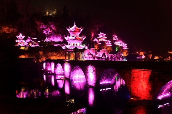 祝圣桥横亘舞阳河600年,西连府城,东接中河山中元洞。桥中矗立17米高的三重檐八角攒尖顶魁星楼,桥下七个石拱,托六百年五溪烟云,映六百年山川秀水,静听桥外青龙洞谶语神韵。