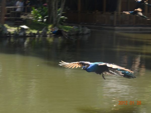 离开野象谷不远,我们来到了森林公园,在一阵疯狂的抢车之后,我们坐上环保车去了爱伲山寨,听少数民族歌手唱歌,跳竹竿夹脚舞,乘滑索穿越河谷,再坐车来到一个人工瀑布前,有一个手挥缅刀砍很多龙的勇士雕像,我们在这里合影。西双版纳的刀导(他姓刀,戴眼镜的一个狡猾的瘦子)对我们说,上面还有一个服装表演没有意思,还是下去看孔雀放飞吧!单纯的我们相信了,回到孔雀湖看孔雀。孔雀湖是一个很美的景点,四周群山环抱一泓碧水,小亭子,椰子树,悠闲的绿草坪。