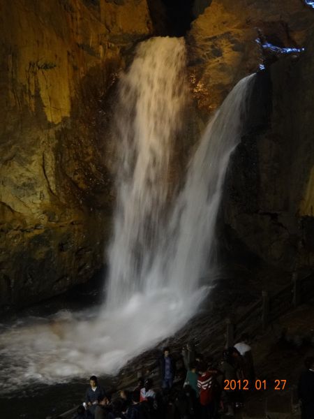 先是过山门,从峡谷中不断下行,就看到一大潭水,碧绿的,大量的人在排队坐船。我们沿着山谷的裂缝,走进了一个洞中大厅,天然形成的大厅里,还有奇石博物馆。据说这里是原始人的大本营。从雄狮大厅出来,看了看似像非像的雄狮石头,来到了神女洞。这里灯光璀璨,钟乳林立,确实好看。从神女洞上去,见到一条溪流,汇成两条瀑布,在一座小桥前交汇在一起,象两条玉龙绞缠在一处,水雾飞溅,确实是人间奇观!