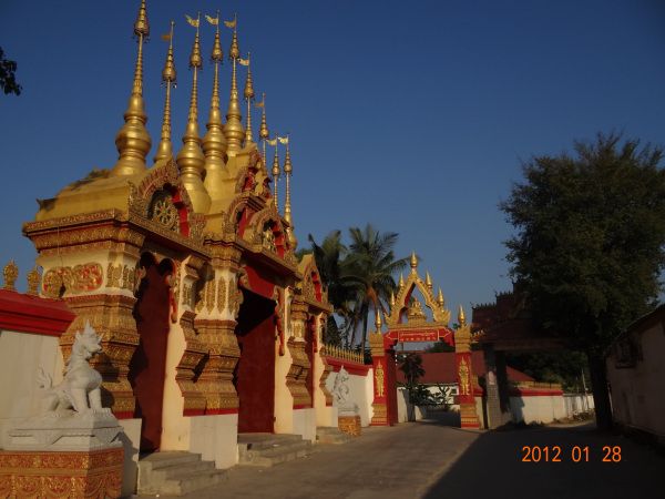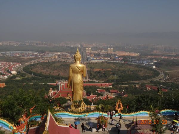 初七早上,刀导把我们带到一个少数民族村寨,据说是给原来的傣王打造银器的奴隶们住的。一个叫玉静的女孩领我们到竹楼上讲风俗,兜了一个大圈,最后是为了推销银器。我在村子里转了一圈,到一个废弃的佛寺看了看,回到村子差点迷路。在浪费了半个上午的宝贵时间后,又去了碧玺店,幸好隔壁就是著名的南传佛教圣地大佛寺,我利用购物的时间溜到大佛寺里玩了一个小时,从仰望大佛的景仰,到从佛的视角看整个佛寺,再往上爬,从高于大佛的角度观察整个景洪市,我理解了视线越远,心胸越宽的佛理。