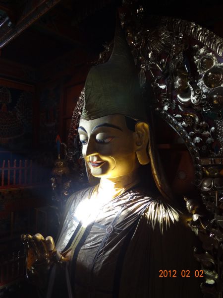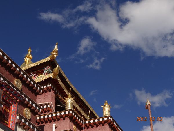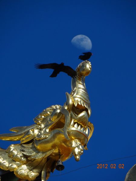 松赞林寺根本不检票,畅行入内参拜了活佛,得到了一个手链,拍摄了阳光照射的金佛和象鼻塔尖上的乌鸦、明月。这是此行的最大收获。