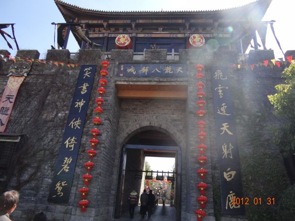 回到岸上,在一个银器店旁边吃过中午饭,下午去天龙八部影视城。城门很宏伟,金庸大师的亲笔题字金光闪闪。