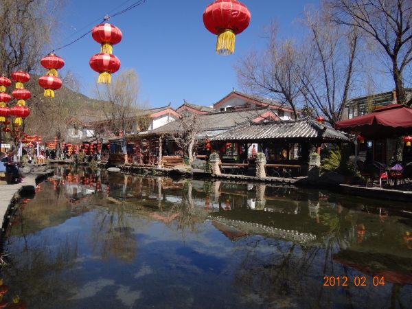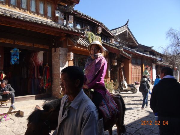 玉水寨看完,东巴谷去骑马,这里是二战时期美国飞虎队的军用机场,很辽阔。然后到螺旋藻店去再接受一次洗脑教育。中午去束河古镇,我感觉这里才是最美的一个地方,水很蓝,房子很古老,人们很惬意,狗很悠闲,阳光很暖,水果很鲜艳。骑马的人走过狭窄的小巷和石板路,串串马铃声和马蹄敲打石板的声音配合着周围的景色简直是一种悠扬的音乐。老刘感叹:真该脱团在这里住一段时间!
