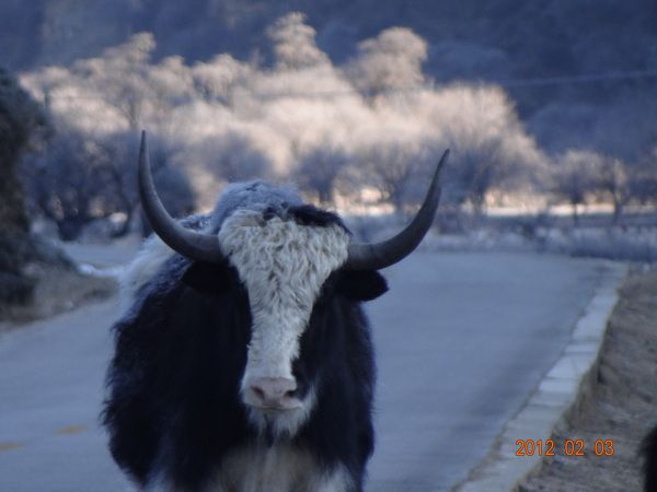 开始步行了,一个水杯,一架相机,我孤独地行走在天地之间,这种感觉真好。路边的树木都挂上了一层冰凌,太阳一出闪闪发光。荒凉的草地上,牦牛在好奇地看着我。