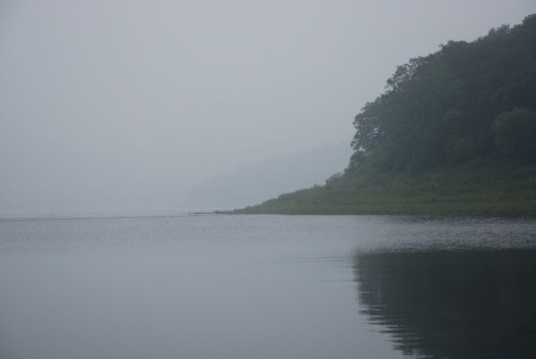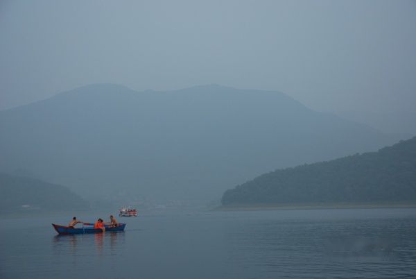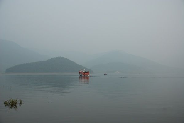 空气特别潮湿,颇有些芬兰浴的意思。湖面上一丝风也没有,只能看到小船过后的波纹一层层向外荡去。从远处飘过来的歌声在山谷里萦绕着,久久也不肯散去。远山已经渐渐没了绿意,偶尔一艘桔红色的游船慢慢的融入那幅青山绿水的画中,成了画中的点睛。随着雾气的增加,周围的一切渐渐模糊,恍若来到了仙境。