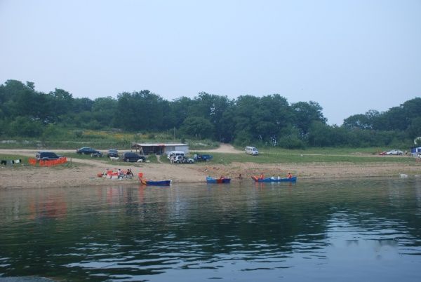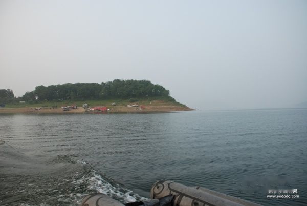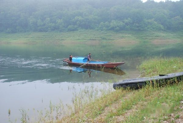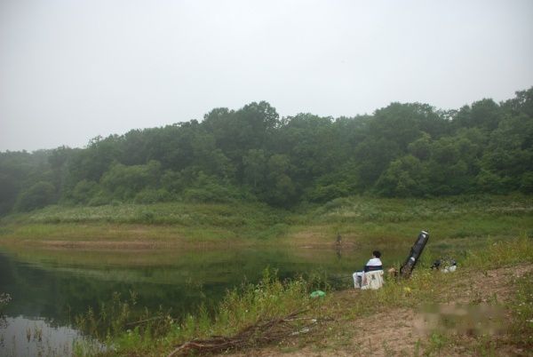 幽静之所,可从真正的林荫小路行进到湖边时,天光大开,别有天地。小路两旁满是山庄、度假村。游人如织,熙熙攘攘,热闹非凡。吃完湖鱼,来到码头准备去山后的江湾里钓鱼。说是码头,其实就是个浅滩,几个大铁钉深入地下能看出是拴船用的。往上些的地方有个简易的棚子,卖些小食品、饮料什么的,棚子下面的空地就是停车场,横七竖八的停着几台车。不远处有个泳区,好多人在水中嬉戏。远处的岸边还有几顶颜色鲜艳的