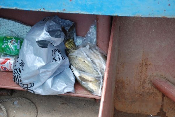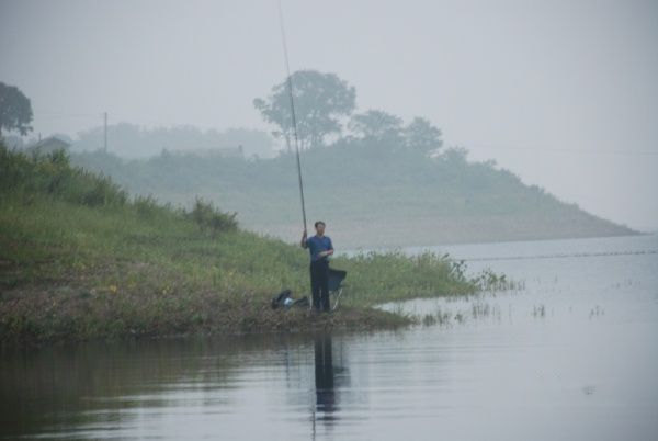 手电筒向接我们的船发出信号,指引着他们的方向,颇象特务接头。到船上才知道,虽然船头的聚光灯瓦数不小,但在湖里却显得很微弱,照不多远。到了钓鱼的那个地方,天也没亮。只好支上聚光灯,大家轮番的把鱼竿架好,静静地等着鱼儿上钩。就快亮天的时候,7.2米手竿的漂陡的一沉,随之又迅速送上来,这回可不能再让它跑了,握住手柄向上一挑,是一只20多公分的湖鲫,哈哈,我们整个团队的第一条战利品。刚把它抄上来,我的海竿也响了起来,又一条35公分的湖鲤被我钓了上来。就别提多高兴,多得意了。这是我第一次野钓,又在众多高手的面前拔得头筹。那些大哥嫉妒的说一只是傻鱼、一只是瞎鱼。我气他们说不管是傻的还是瞎的,你们也整上来几条啊,大老远来的,可别丢了手艺啊。