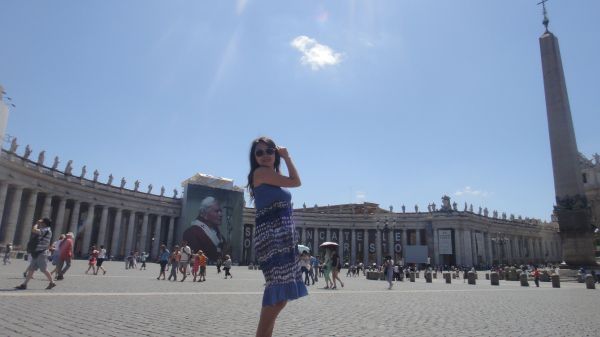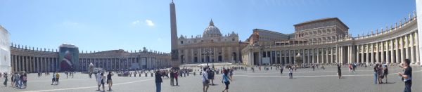 由于时间有限,我们没在那里停留,直接去了梵蒂冈城国(CITTA DEL VATICANO),一进到梵蒂冈,两个半圆形的圆柱扇面圈成的广场,左侧圆柱中央挂着巨幅罗马主教教皇的画像,右侧的人们排队想进入教堂,看那副在2012里断裂的《创世纪》。