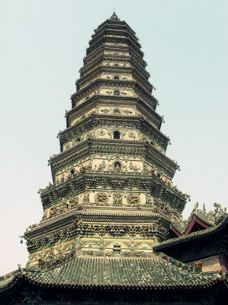 飞虹塔位于山西洪洞县城东北17公里的广胜上寺。塔身琉璃镶嵌,俗称琉璃塔。始建于汉,屡经重修,现存为明嘉靖六年(1527年)重建, 天启二年(1622年)底层增建围廊塔平面八角形,。