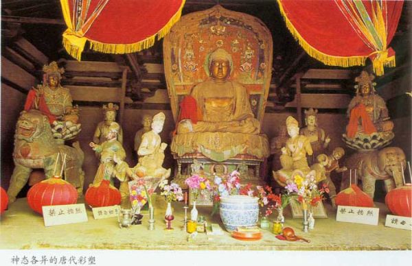 坛上全为珍贵的唐代彩塑,释迦牟尼佛像居中,手结说法印,左右文殊普贤分坐狮子和白象,还有阿难与迦叶两位尊者,胁侍菩萨、童子、戎装天王,形象生动,体态丰腴,衣纹流畅。