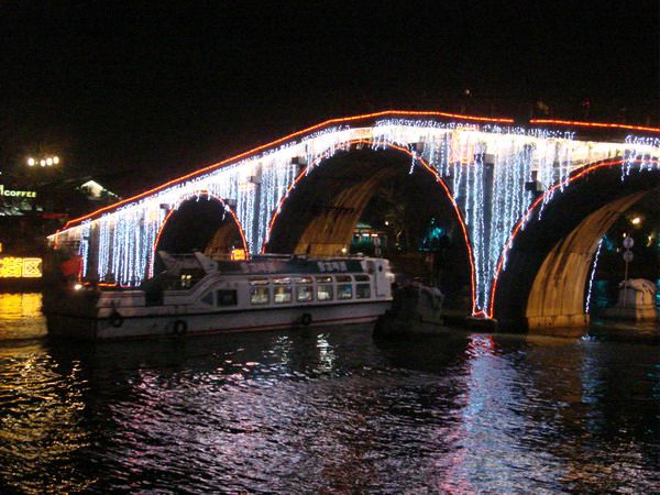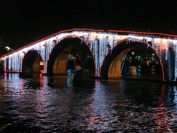 游船悠悠,徐徐穿过桥洞,形成一道绚丽的景观 .