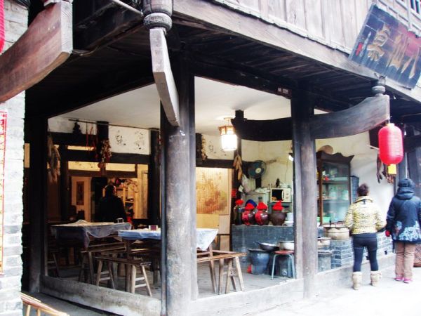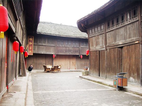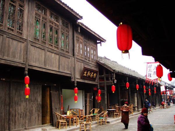 在文风塔和古戏台之间,便是古镇的一条悠长的古街,青砖铺路,两旁古色古香的纯木板房,大红灯笼与店铺的旗幌交相辉映,一派浓浓的中国年的喜庆气氛和川西古镇的味道。