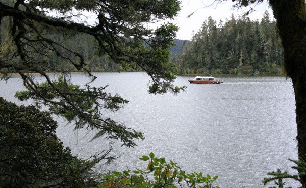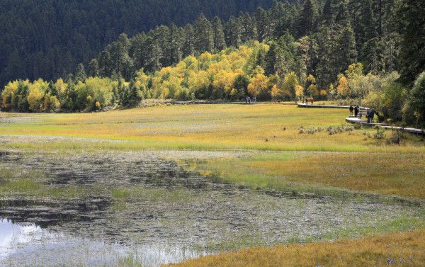 入园上环保车,每车配备一名导游讲解。游览路线分三个点,依序为:硕都湖、弥里塘、碧塔海。这是硕都湖,(也有标属都湖的)湖畔湿地: