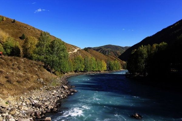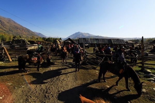 从禾木走山路去贾登峪,彼度不大,难度不高,据说这是中国最美的十大徒步线路之一,全长40多公里,徒步需要九至十小时,我们选择了骑马。带上摄影包、角架、路餐和衣服,拉杆箱跟车到贾登峪等我们。骑马前领队简单告知了注意事项,最重要的是不能站在马后。上午九点半后出发,我骑的是一匹棕色的马,很高大。一路上看到徒步客、背包族和骑着山地车的外国人。开始感觉很新鲜,也很兴奋,一切还算顺利,慢行,小跑等。但骑了大半路程后,在一次跟着其它马一起奔跑时由于是下山,马失前蹄,把我从马背上抛了出去,由于是第一次骑马,一点经验也没有,也没想到去控制马,在马失前蹄的一刹那,我就想到了马不要翻在我的身上或后马踩在我的身上,我顺势一个前翻,立刻起身,在我还在查看自己的状况时,马已起身,带上我的三角架奔离。还好,一点也没什么,只能徒步赶马。
