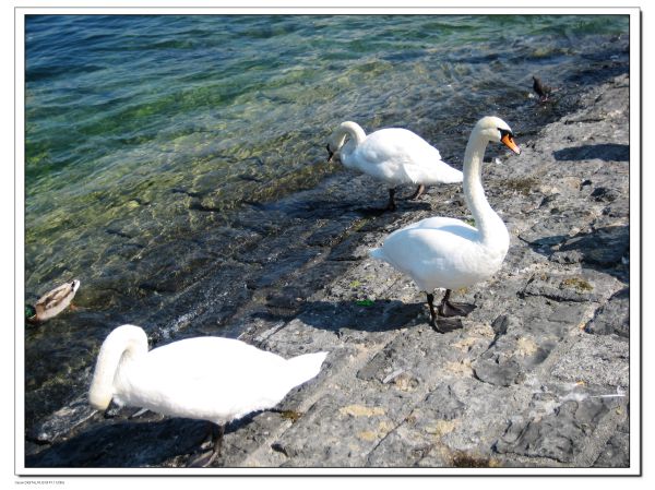 坐在栈桥上,时常会看到湖里的天鹅跑上来晒太阳,那些高贵的鸟儿放下矜持,摇摆着身躯走到你的面前,痴望着你,要求跟你分享手中的食物,忍不住将袋中的面包、饼干洒向它们。