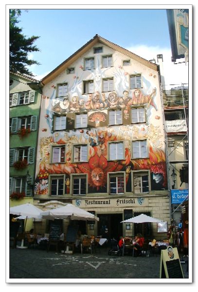 从小教堂广场西行,小城的优雅古风扑面而来,街道两侧全是中世纪和文艺复兴时期的建筑,也有稍后出现的巴罗克式楼宇。转到广场便迈不开步了,这里实在是太古典美了:鹅卵石铺就的街道,被岁月磨得光滑,那是一种架式,就算时光荏苒。四周环绕着一栋一栋的老房子,房子的外墙上绘满了漂亮的彩色壁画,画上画的不外乎神话传说、宗教故事之类的东西,虽然内容看不太明白,却不妨碍我打心眼儿里喜欢它。