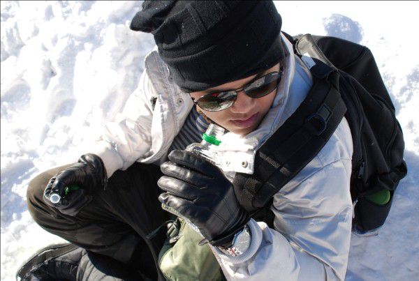 爬了三个半小时终于抵达山顶,放眼望去,白茫茫一片,就是有只苍蝇,我都能把它瞄准。背上已经冒汗珠了,幸好刻意没有穿很多衣服。下山的路是条铺满了雪很宽敞的公路,时不时有吉普飞驰而过。我们唱啊跳啊,发现没有水了,只有一瓶没喝完的白酒。