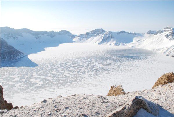 皓哥说过,下雪就看不着天池了。当我们坐着越野车到达山顶的时候,却是大大的太阳,小雪花儿早就无影无踪了。神秘的天池彰显在我们眼前,大方,没有一丝扭捏。我在网上见过夏天的天池,很美很蓝很安静,没有涟漪。眼前的天池,被冻住,晶莹剔透仿佛能把它看穿,池面上有很天然的纹路。那又是另一种风韵了。