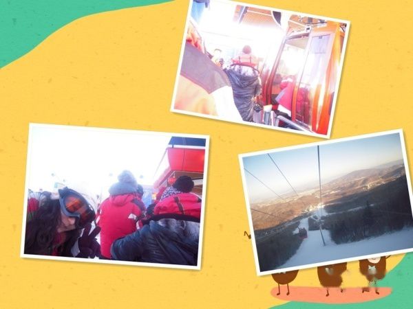 然后是重头戏滑雪。看到很多穿着艳丽的专业滑雪服的帅哥美女们在漂亮的雪道滑行,然后我们这些游客们无奈的去了初级滑雪区……T-T