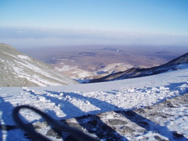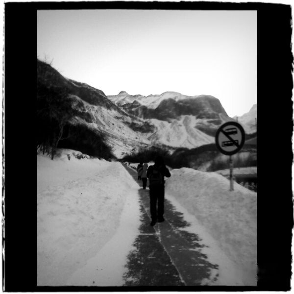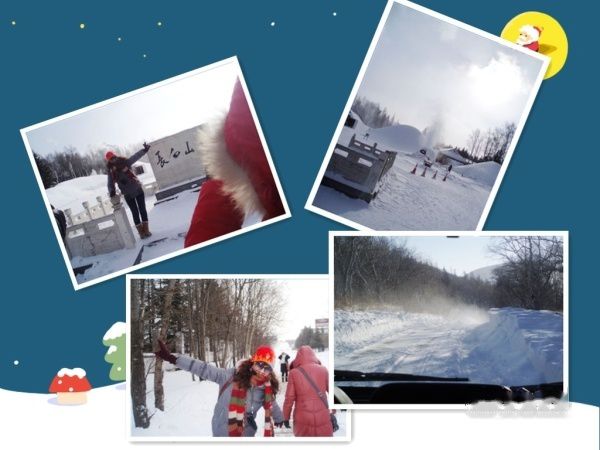 我们都以为穿的够多了,当然行走在长白山大雪皑皑的路上还是没问题,甚至我自己的雪地靴也应付得了这厚厚的积雪,但呼出的气不断的把口罩弄的湿润然后结冰,墨镜上全是雾气,完全没办法佩戴,还是让我们觉得这里和哈尔滨不一样。山下温度,零下20多度,山顶温度,零下30度……
