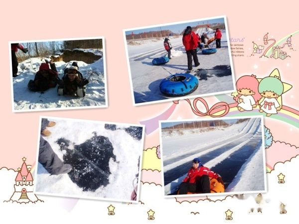 接下来是滑轮胎。有点象夏天在欢乐水世界玩的划水,不同的是,那是穿着泳衣带着冲水板,这可是穿着滑雪服拖着大轮胎上去。冰面很厚,滑下来感觉很有趣,连拖着大轮胎玩了两次。