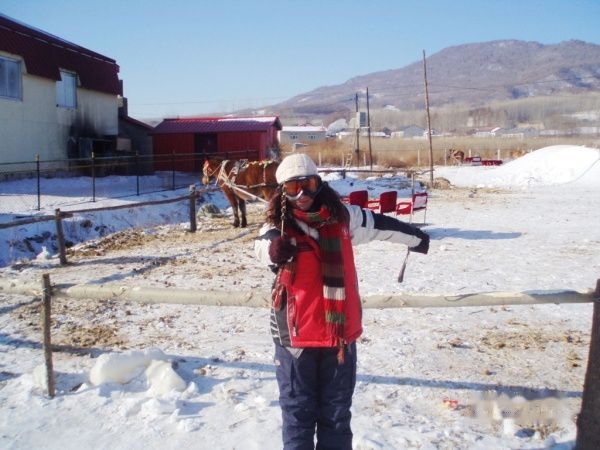 虽然已经穿了三条裤子、四件衣服,但还是担忧亚布力零下二十度的低温和冰雪,于是在导游的怂恿下,每个人都租了滑雪服和滑雪镜穿戴在自身的衣服上 = =所以这一身是四条裤子、五件衣服的傻妞与糖葫芦的合照……