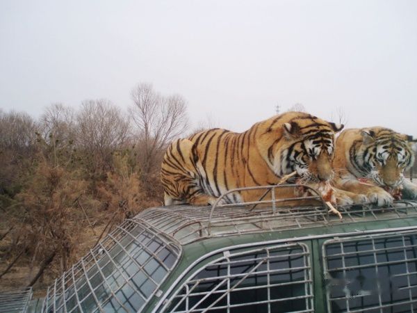 坐着旅行环保车,缓缓驶入有1000多只东北虎的基地。有游客买了活鸡欣赏东北虎捕食,我们也顺道看了个清楚,活鸡从投食车扔出来不到一分钟,就给跳上车的东北虎一口咬断喉咙,真是瞬间秒杀……