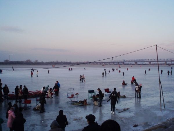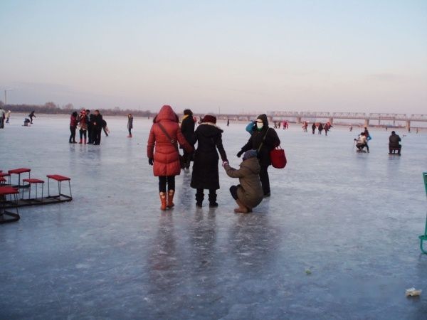 冰冻深达一米多的江面,很滑,很冰,很新鲜的感觉,就像走在大冰箱上面似的。