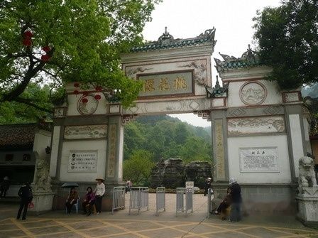 园内的桃花已谢,走不远就是方竹亭,很古老的建筑,顺着台阶拾级而上看见 集贤祠、桃花观、御碑亭、高举阁等,山上的树木繁茂,不时有四季桂的花香飘过来,深深地呼吸,感到无比的愉悦。顺着600多米的竹廊走过来就是桃花潭,有游船停泊,秦人村努力再现着桃花源记当年的景象,走过人工开凿的秦村古道,洞里岩壁上有水滴下,潮湿幽暗。桃花山占地不小,一路没停游览近两个多小时