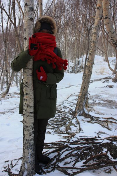 抱着这棵树不放,此时我在抢新鲜照片,围巾已经被风吹散了,好心的景区工人(图左)过来给我扎围巾,虽然气温很低,心里却是暖暖的。