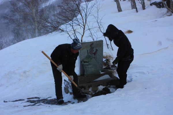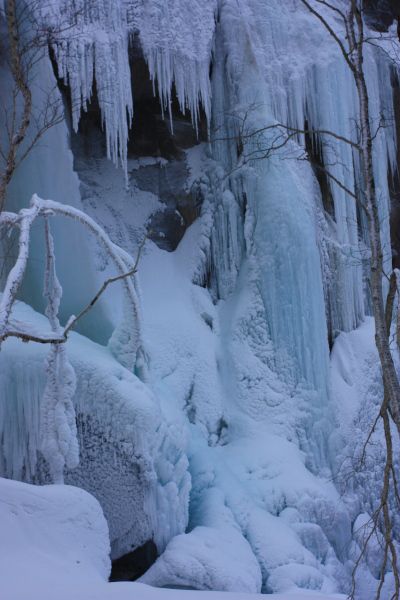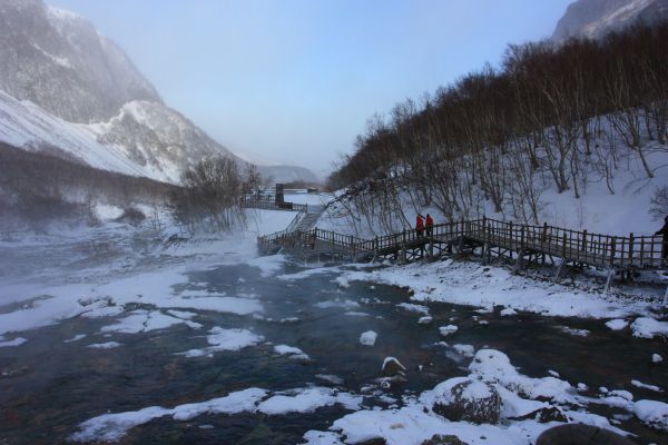 12月11日,约好7点30来接的司机,晚到15分钟。达到北坡已是8点半左右,出示南航登机牌和身份证,免景区门票(100元),85元的车费还是要自己掏。窗口买票时已被告知天池没法上。不多想,看不看得到要看机缘,也不强求。坐上景区环保车直接到达终点站,9点左右开始步行观长白瀑布。虽然天气不好,但是心情还是挺激动,毕竟没体验过这么冷的温度,人总是喜欢给自己定个杠杠,自豪一把。风是冷烈的,心是火烫的,下车步行200m左右就到了聚龙泉,都说相机怕冷,也不敢轻易拿出来,一路以观赏为主。受当地高人指点,我们抄了近路,此路景区的工作人员还在奋力清扫中,还好也没让我们绕道,这一来,有了出头鸟后面必有跟风的,爬上高一层台阶,发现陆陆续续跟了10来号人,心里也有了点底,转角碰到两中年男人,冲着我们说:“别怕,路可以走,慢慢来,可以看到瀑布。”一来感谢他们的好心,其实心想,我们怕了吗?翻过坡,达到平地,就听金赛在喊:“瀑布”,我忙注意脚下,还没来得及看前面呢!看到时,还是小小激动了把,这时也顾不得冷不冷,拿出相机扫几张吧,甚至还脱了手套,围脖也没护住脸,这不,脸就是在那里吹伤的。