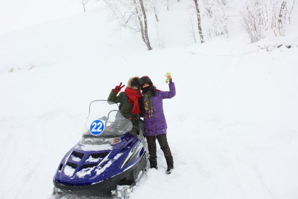 20分钟后车子准时出发了,只为我们两人!售票时工作人员告知只有大峡谷可以去,当景区车开到三叉路口,本以为要跟左手道的天池说bye bye,开往右边的大峡谷时,司机打了左,当时我和金赛都沉默了,应该想的是一样的吧,哈哈。下了车,坐了免费的雪地摩托,5元的保险费还是要付的。