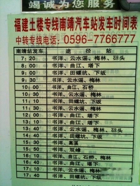 南靖土楼 客车时刻