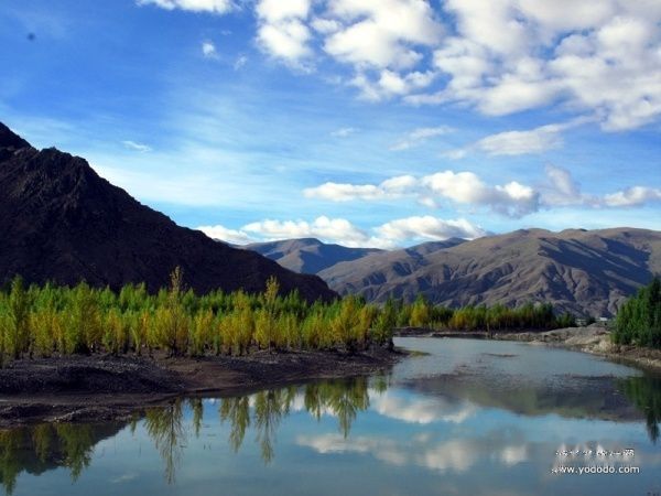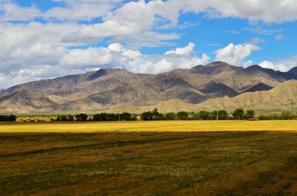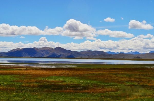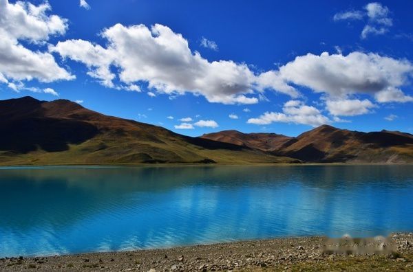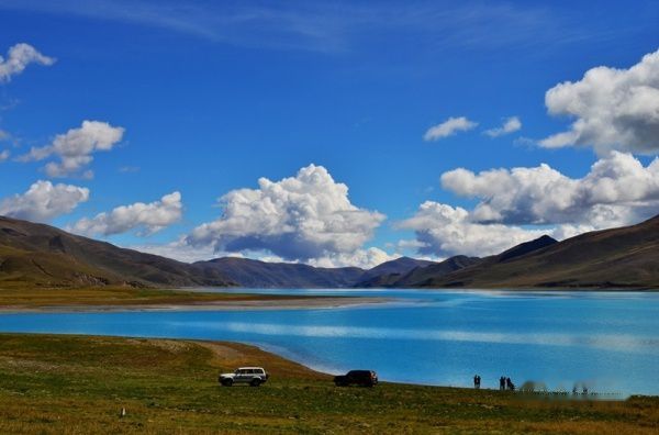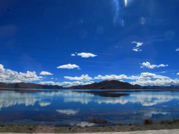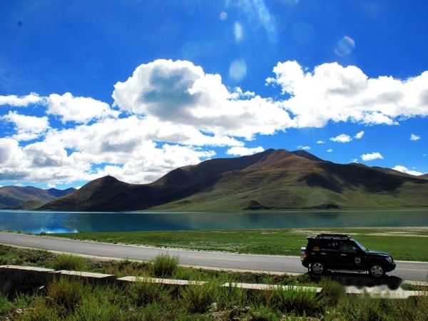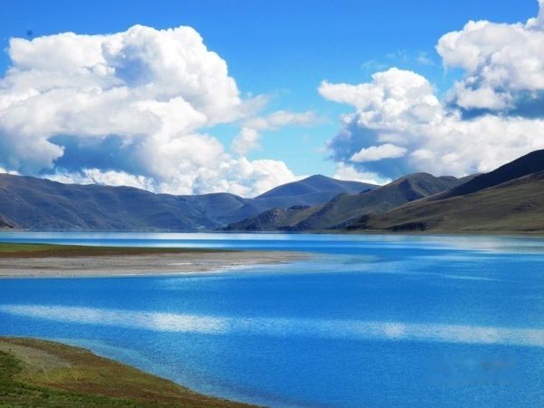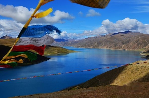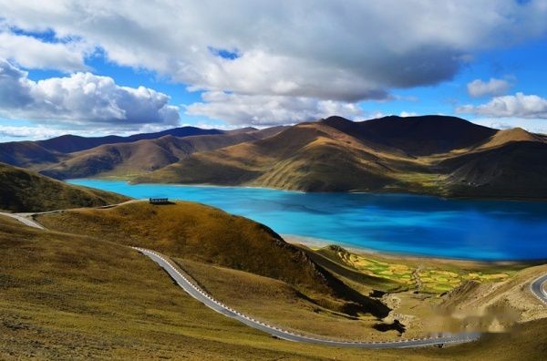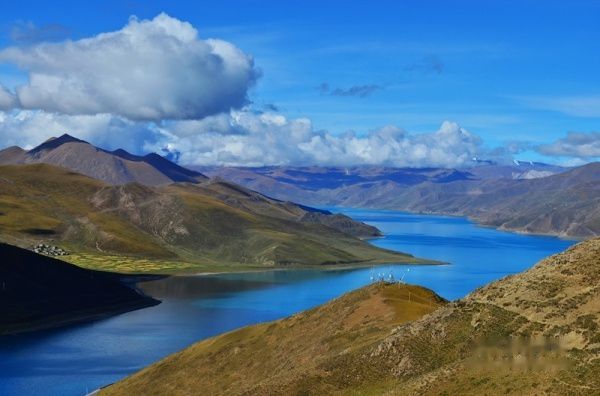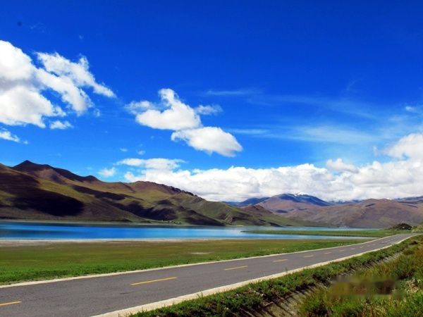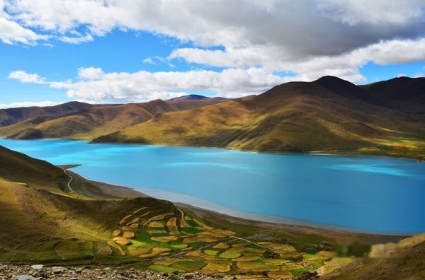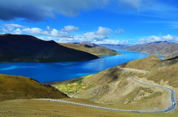 出了拉萨城,沿雅鲁藏布江江岸而行,海拔一路攀升,车子在那像蛇一般弯曲险峻的山路上爬升,终于到达了海拔4670米经幡飘扬的冈巴拉山口,随之赫然出现的羊湖强烈地冲击着我们的视线,蓝天白云下羊湖像一块浑然天成的翡翠躺在那里,折射着高原的阳光和蓝天,呈现出层次丰富的各种蓝色。在明亮纯净的湖边,分布着一块块黄的绿的色块,距离太远,分辨不出到底是青稞地还是草地,蓝、黄、绿这些干干净净的大色块共同构成了这一方世外桃源的净土。