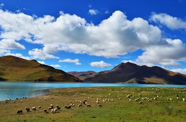 蓝天、白云、湖水、如繁星般的羊群,绝美的画面