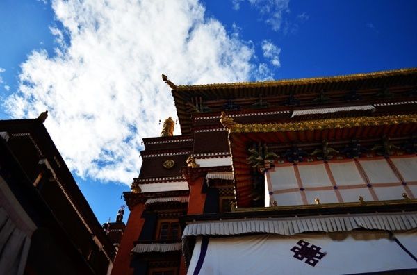 扎什伦布寺依山而筑,背附高山,座北地向阳,殿宇依次递接,周围筑有宫墙,宫墙沿山势蜿蜒迤逦。近看金顶红墙的高大主建筑群更为雄伟、壮观。寺中错钦大殿可容2000人诵经,想象诵经当日,该是多么壮观。而最令人惊叹的是大弥勒殿,殿高30米,内有强巴佛蹲坐在高达3.8米的莲花基座上,面部朝南,俯瞰着寺宇,佛像高26.2米,肩宽11.5米,脚板长4.2米,手长3.2米,中指周长1.2米,耳长2.8米,单鼻子上就可以站一个人。据说铸造这尊佛像,需要110个工匠,花费4年时间才完成。我不禁折服于工匠们的鬼斧神工,姑且不说佛祖的力量如何强大,单是仰望于这尊雄伟的大佛就已经令人心生敬畏。
