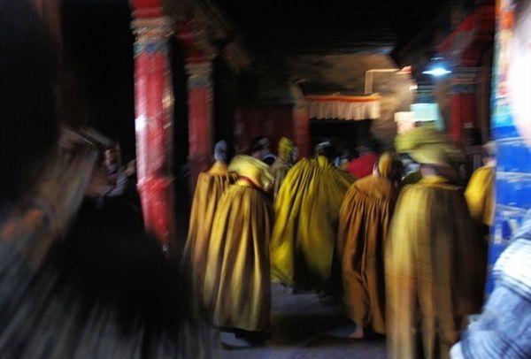 身穿僧服,赶着进讲经场的僧人们