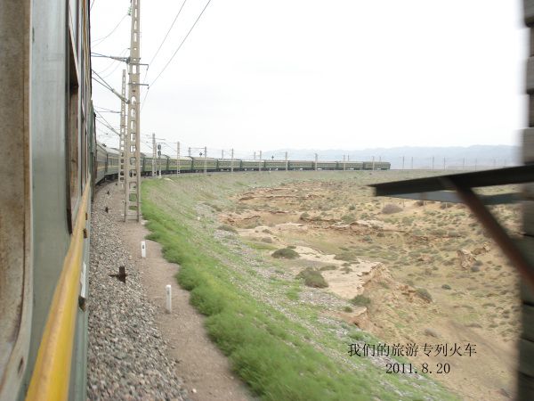 8月20日一大早,车箱内的灯还没有亮,爷爷奶奶们就早早的起床了,象广播喇叭一样开始广播了。同样重复着昨天的火车上的生活。下午1点半左右,经过宁夏的沙坡头风景区,那里的山是光秃秃的,黄沙遍布,没有什么植被,但景色还是 比较的美的。