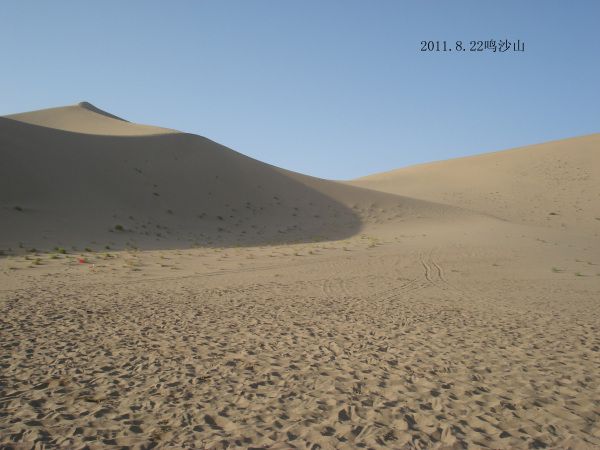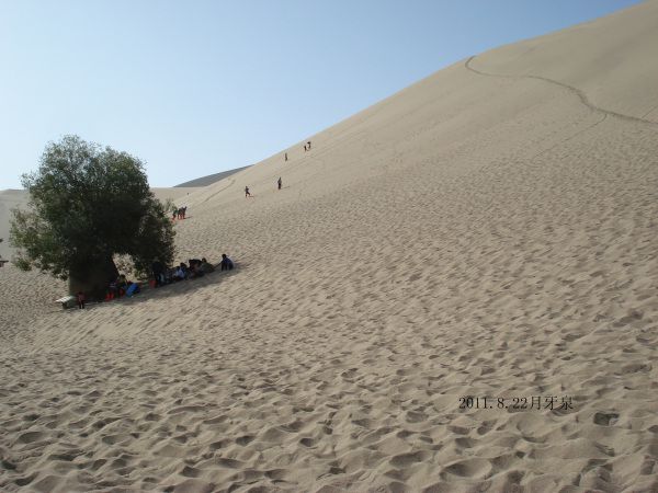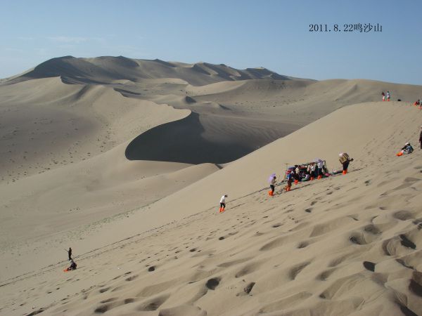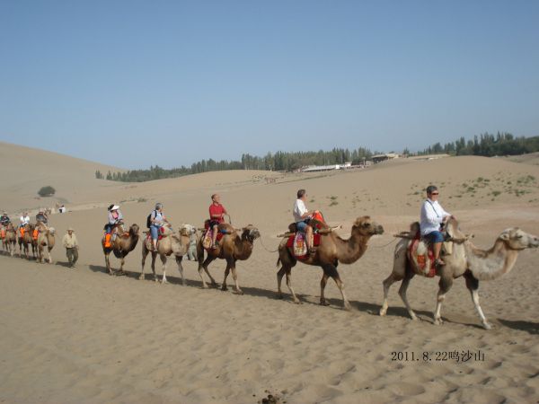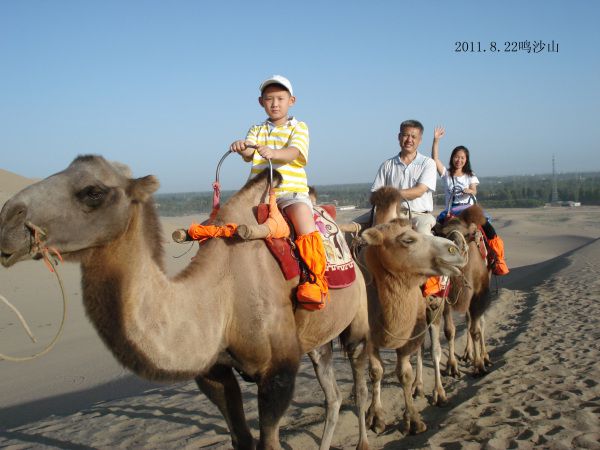 8月22日,吃过早餐后,参观沙漠奇观----鸣沙山、月牙泉,在这里,交通工具有骑骆驼,吉普车和电瓶车,我们选择骑骆驼(最终的结果证明,选择骑骆驼是最正好的选择),导游让我们自己买票,卖票的旁边立个牌子,上面写着100元、80元。通过打听才知道8点之前100元,8点之后80元,看了下表,已经是7点55分了,那就等一会吧,最后我们是80元买的票。第一次骑骆驼,还真是害怕,尤其是骆驼的起来和趴下,这两个动作超级的恐怖,你会感觉幅度很大的前俯身和后仰身。骆驼走路的姿势很优雅,很有节奏,你的身体也会随着它一左一右的扭动。回头看看身后的骆驼队,被朝阳拉的常常的斜影,游人被骄阳炙烤的同时,尽情的玩着。