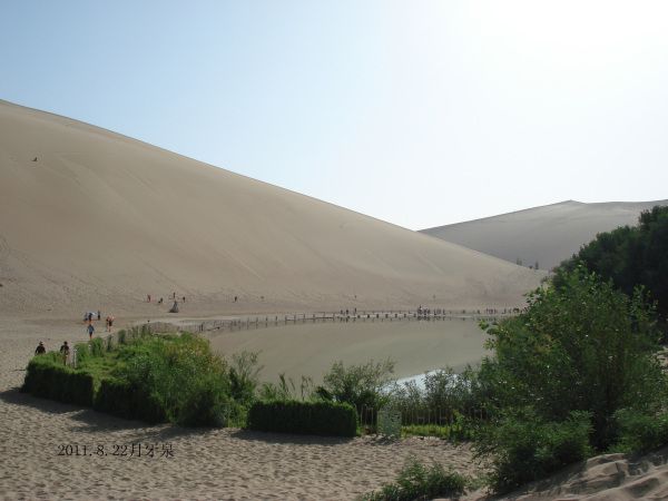 和骆驼的主人说好了,9点半驼我们前往月牙泉,月牙泉被鸣沙山包围着,月牙形的清泉,泉水碧绿,如翡翠般镶嵌在金色 的沙丘上。泉边芦苇 茂密,微风起伏,碧波荡漾,水映沙山,蔚为奇观。